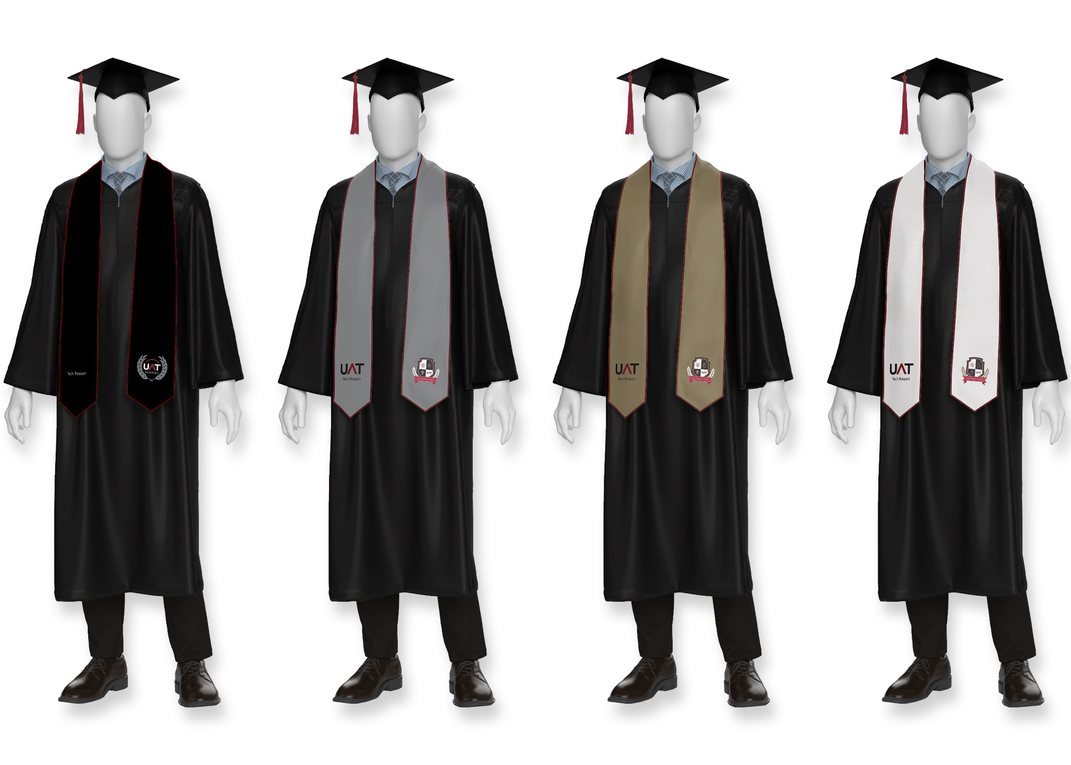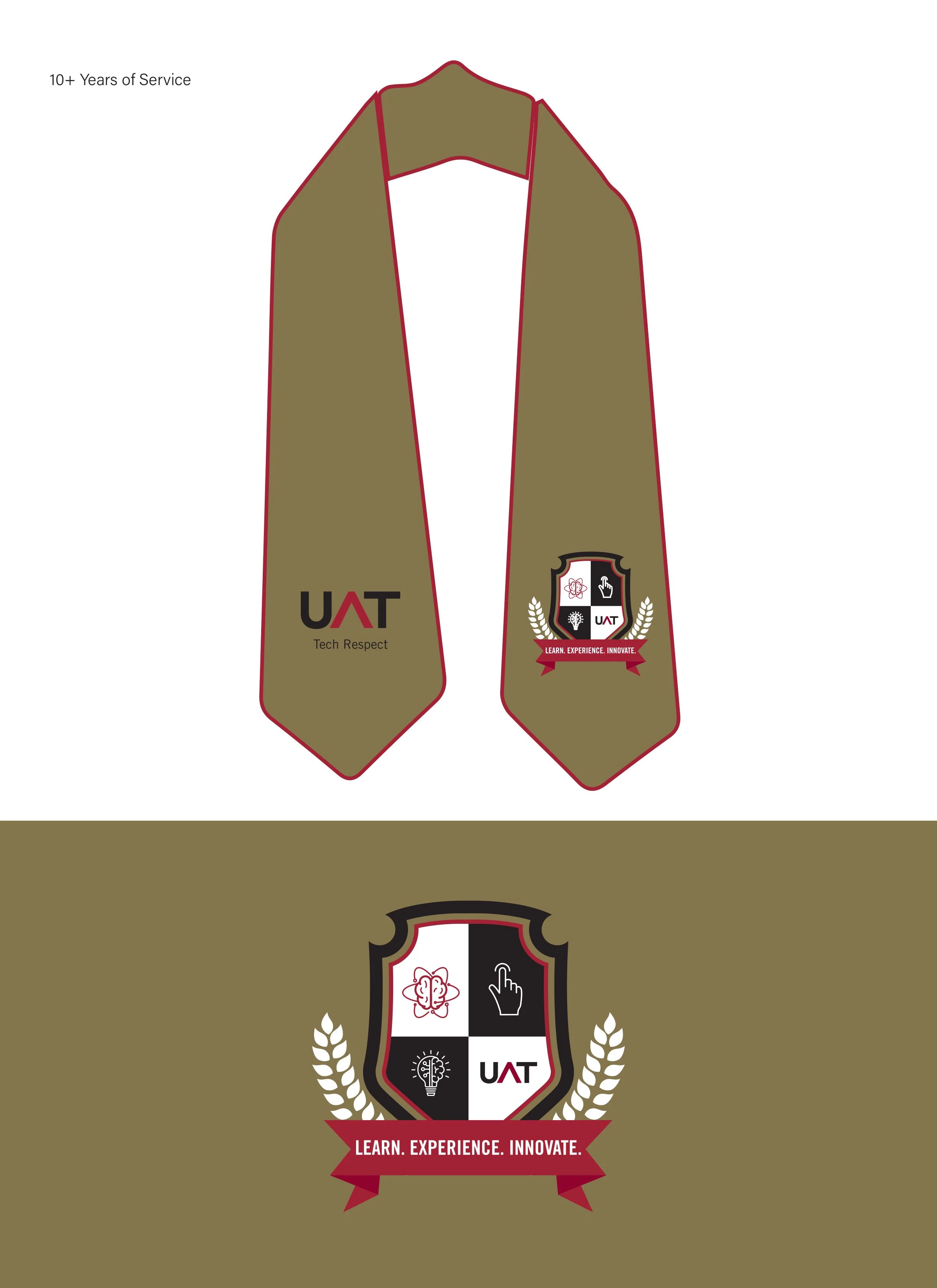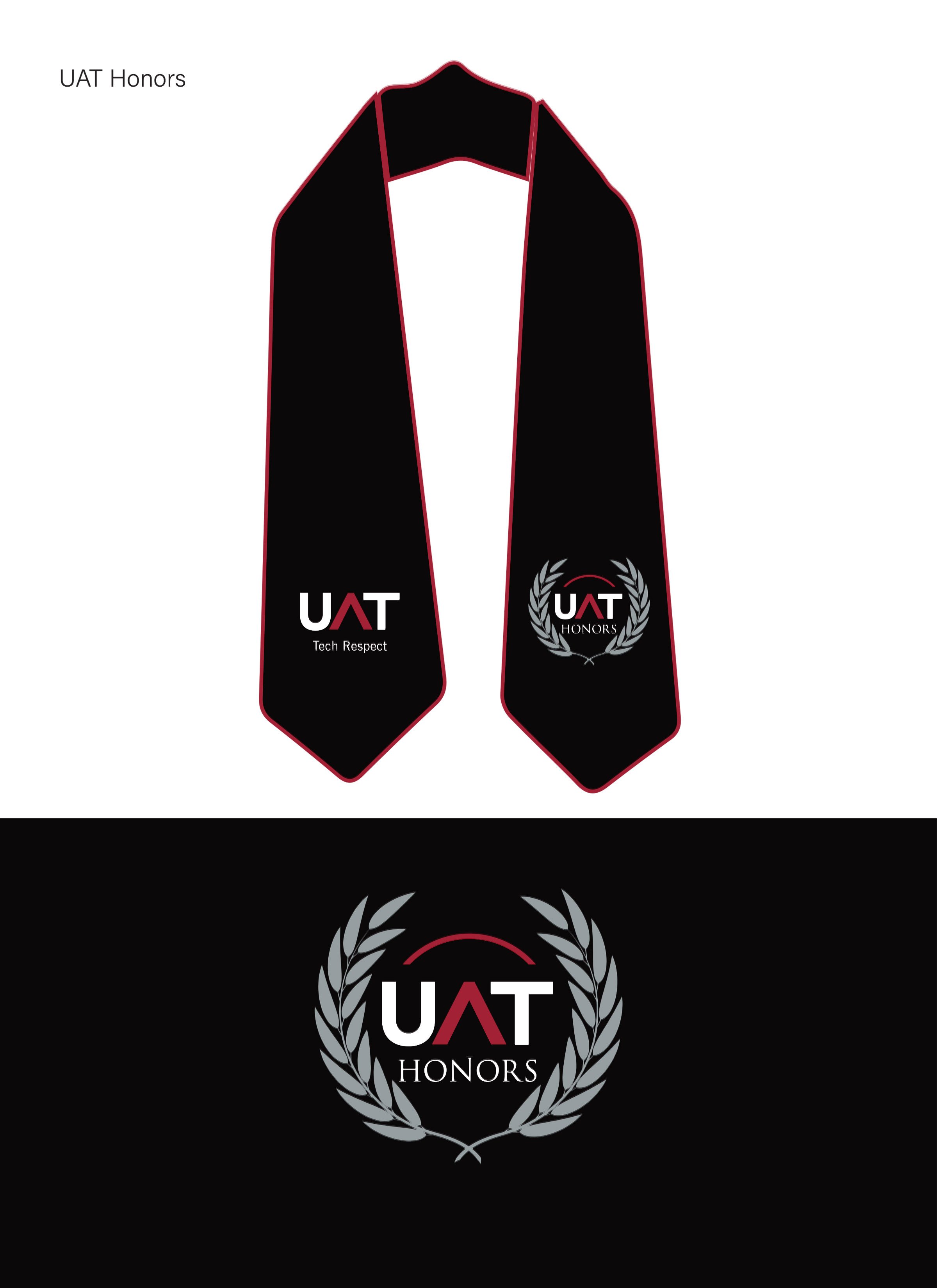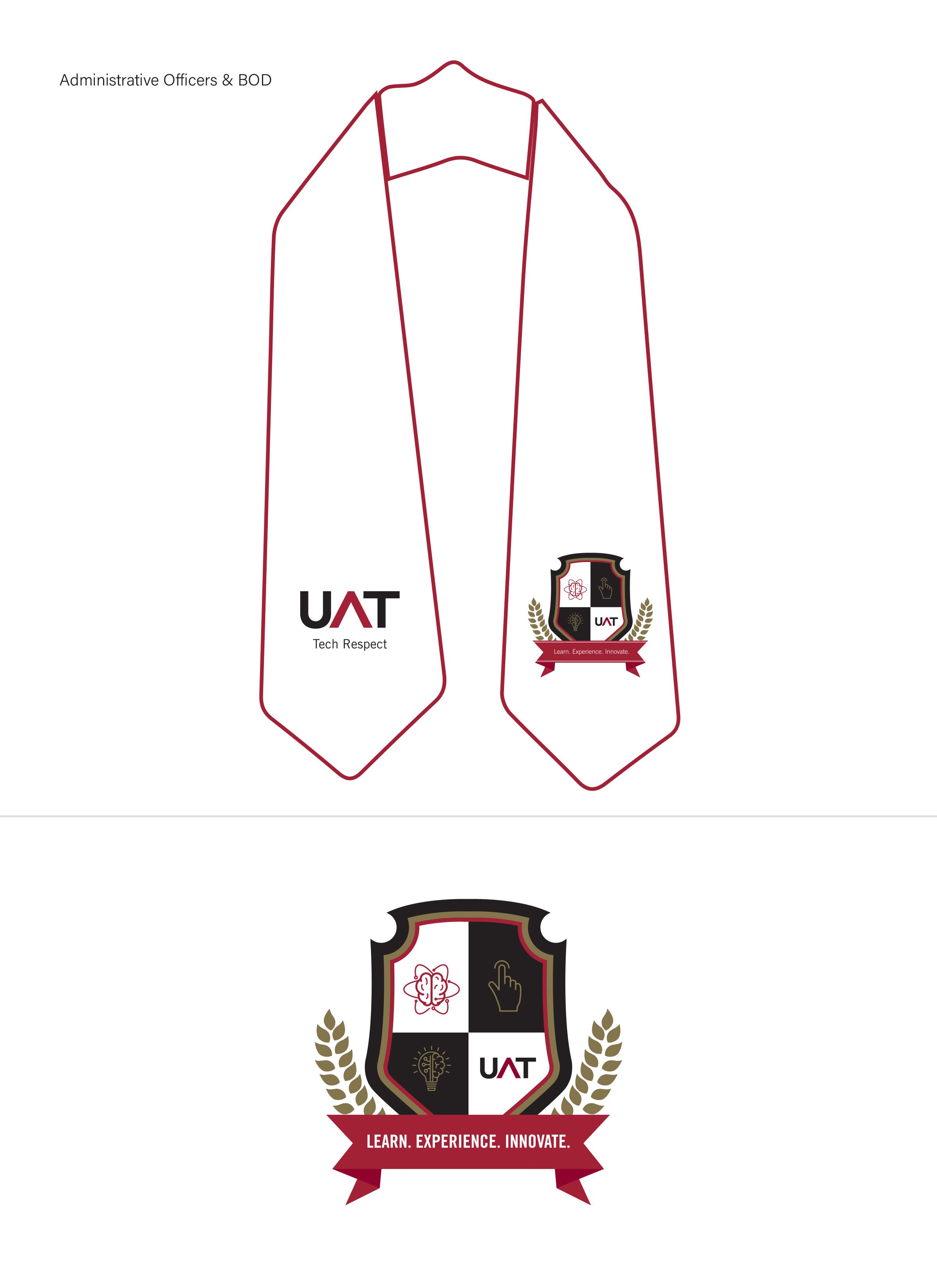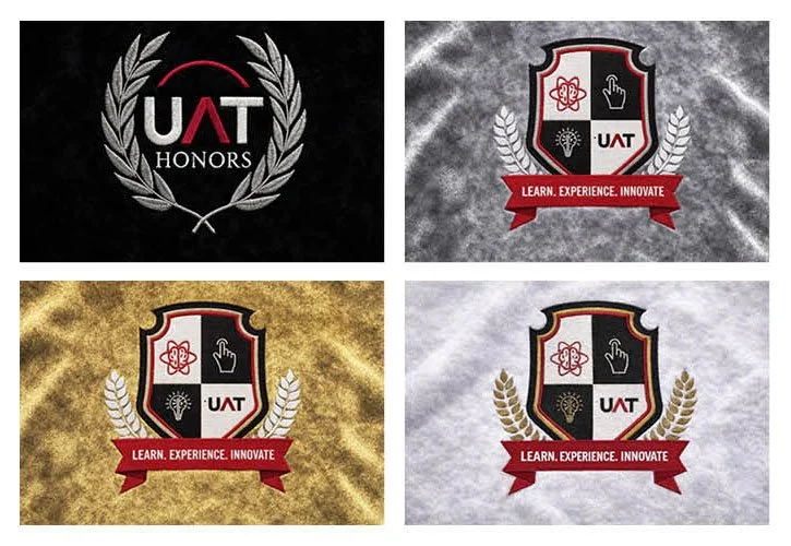 The project began with the design of a badge that balanced academic tradition with the university’s forward-looking identity. Once approved, the mark needed to be translated into a physical stole worn during graduation, serving as a visual distinction between three groups: faculty and staff with five or more years of service, those with ten or more years, and members of the Board of Directors. A fourth version was created for UAT Honors students using a preexisting logo, which I sourced and prepared for embroidery in coordination with the vendor.